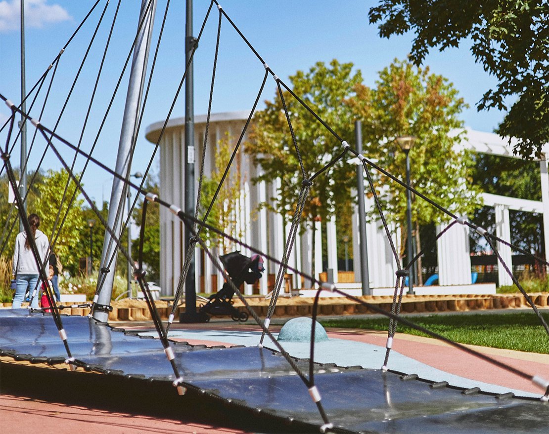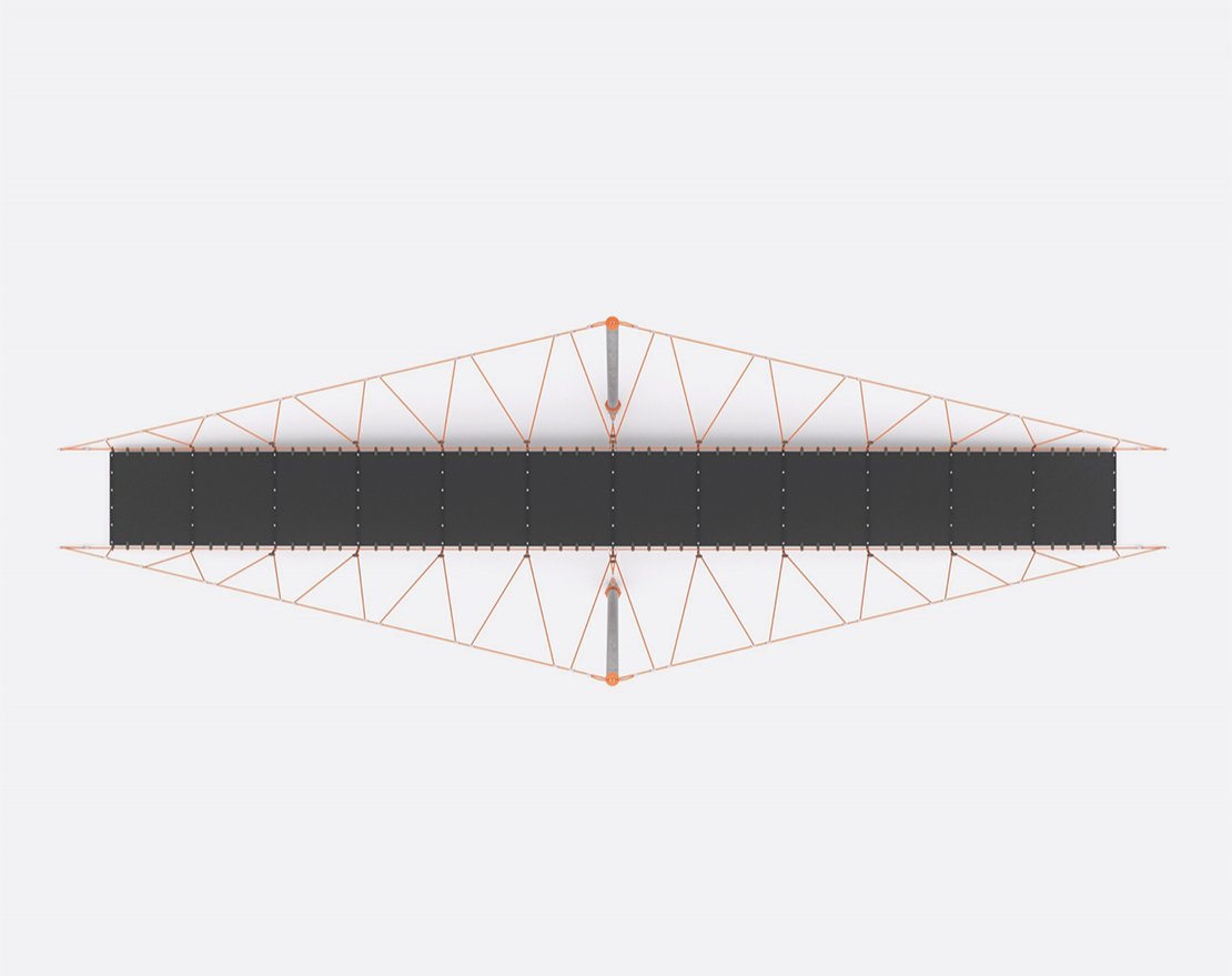 Канатная конструкция серии Skat. Представляет собой подвесной мост, выполненный из металлических опорных столбов, канатной сетки и резиновой конвейерной ленты.