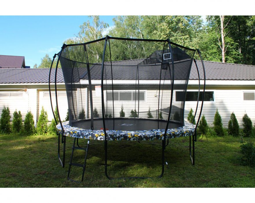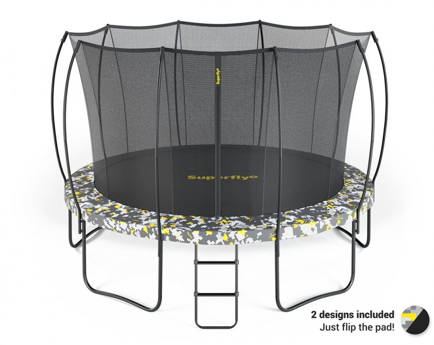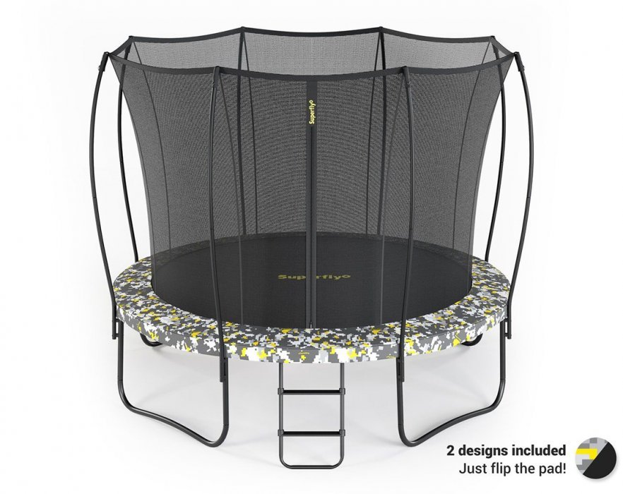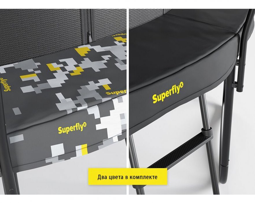 Внешний вид. Серия Superfly имеет двухсторонний защитный мат, то есть вы можете переворачивать мат и менять дизайн батута. В комплекте два цветовых решения: это Digital Como — он же цифровой камуфляж и Black classic или просто классический черный.