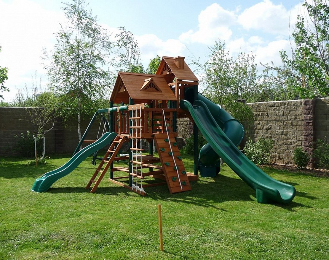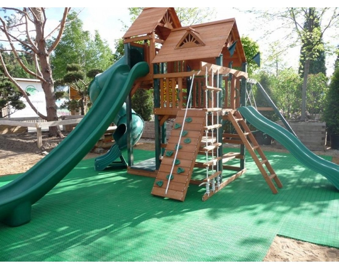 Оригинальный внешний вид игровой площадки Эверест Делюкс 2 с высокими башнями и тремя горками отлично впишется в ландшафт загородного участка или детской площадки, а его функциональность понравятся детям. Эверест Делюкс 2 — комплекс для организации активного детского досуга, который включает в себя три уровня: первый — это песочница и столик со скамейками, второй — игровая платформа в виде форта с крышей, третий — закрытая башня с выходом на горки. Благодаря такой конструкции, а также наличию большого количества игрового оборудования детская игровая площадка позволяет интересно проводить время одновременно целой группе детей разного возраста и уровня физической подготовки.