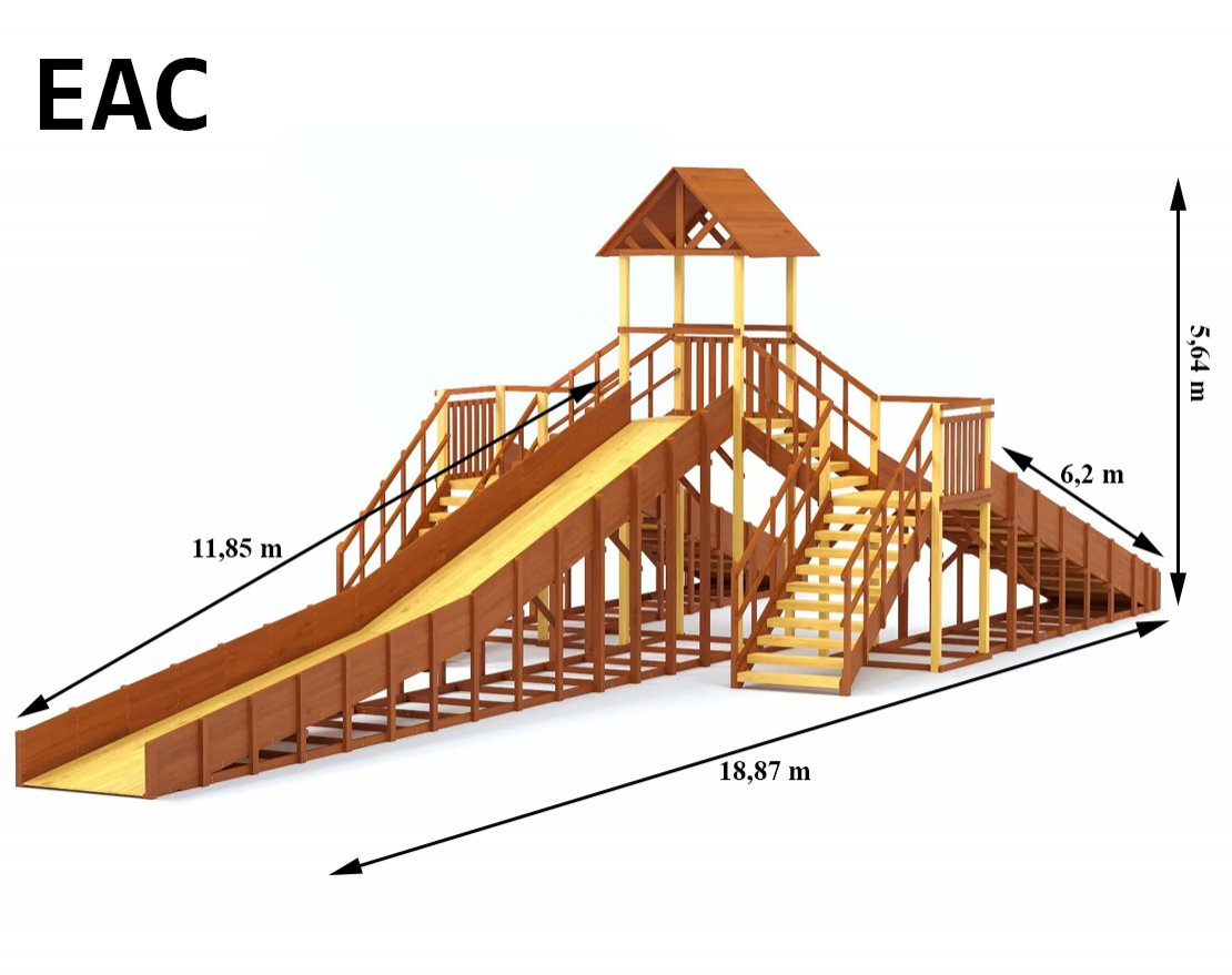 Конструкция тщательно спроектирована и выполнена из качественных материалов, что гарантирует безопасность и долгий срок службы. Каркас изготовлен из надежного клееного бруса, а в качестве защитного покрытия использован лакокрасочный состав с разрешающим сертификатом для применения на детских площадках.