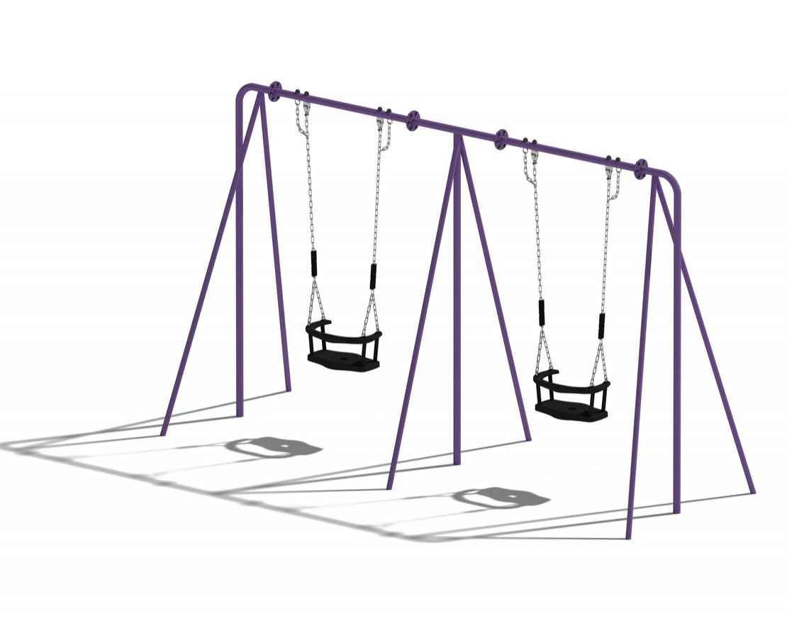 Стойка качели из трубы сечением Ø 42 мм и 32 мм, металл имеет плавные радиусы, тщательную обработку швов, покрыт порошковой краской. Подвес из металлической цепи диаметром не менее 5 мм. Сиденья качелей изготовлены из влагостойкой окрашенной фанеры толщиной 18 мм. Каркас из трубы сечением Ø 22 мм. Деревянные детали должны быть тщательно отшлифованы, загрунтованы и окрашены профессиональными двухкомпонентными красками в заводских условиях.
