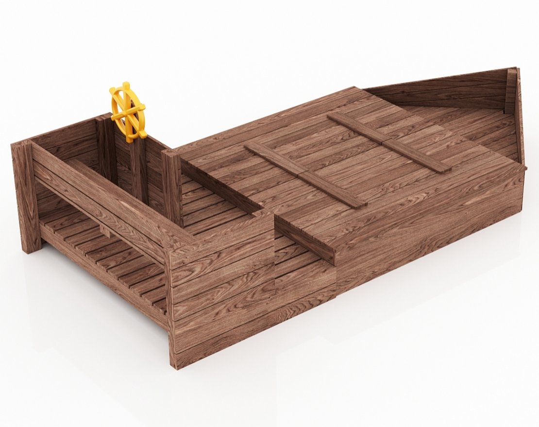 Детская песочница-кораблик и штурманская рубка со штурвалом.