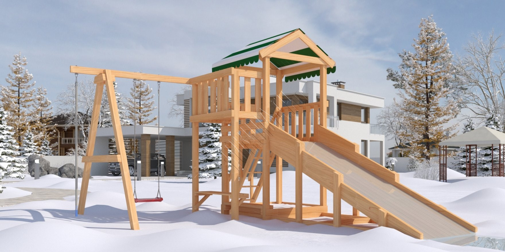 Всесезонная модель Гарда 1 обладает натуральным цветом дерева без покрытия и модульной конструкцией. Одновременно на площадке могут играть несколько детей. Основа конструкции – игровая башня с балкончиком и яркой пластиковой горкой.