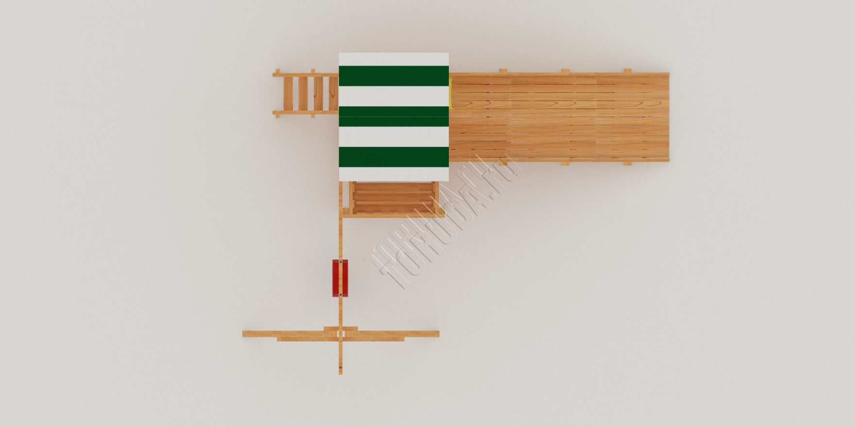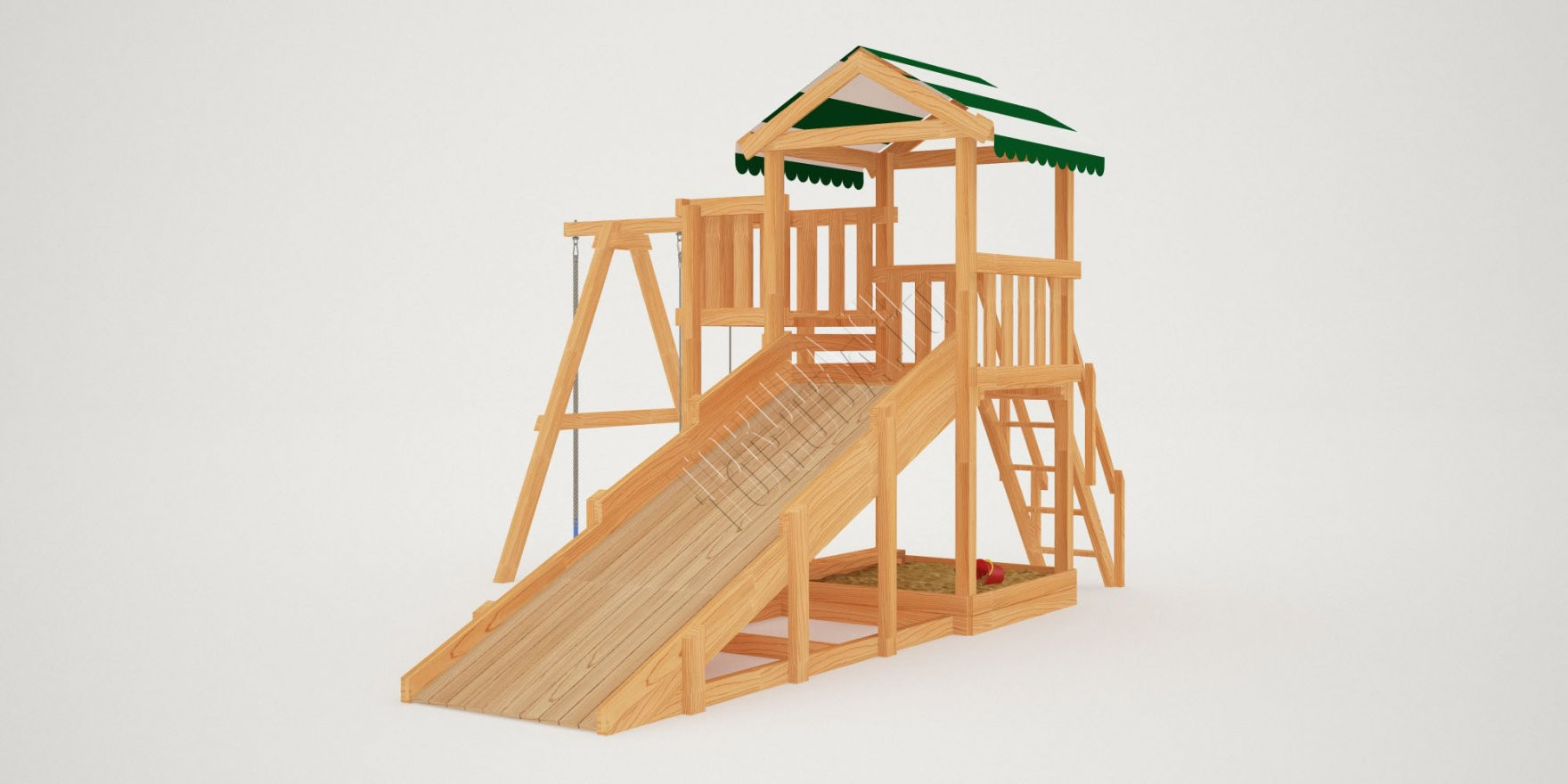 Также в модели есть еще один дополнительный канат для полноценного лазания – он расположен слева от качелей. Для любителей более спокойных игр предусмотрена песочница с удобной лавочкой для игральных принадлежностей. ВАЖНО: Комплекс поставляется без окрашивания и отверстий для крепежа, но его сборка, как правило, не представляет трудности для опытного хозяина. Для разметки отверстий в комплект входит лекало.