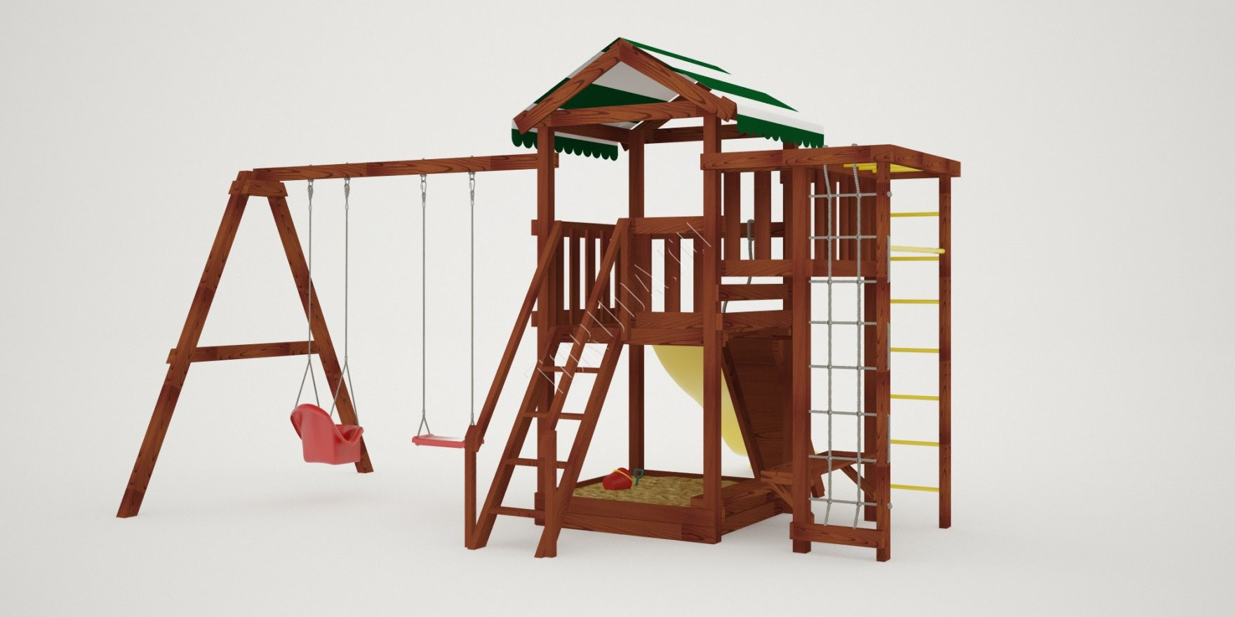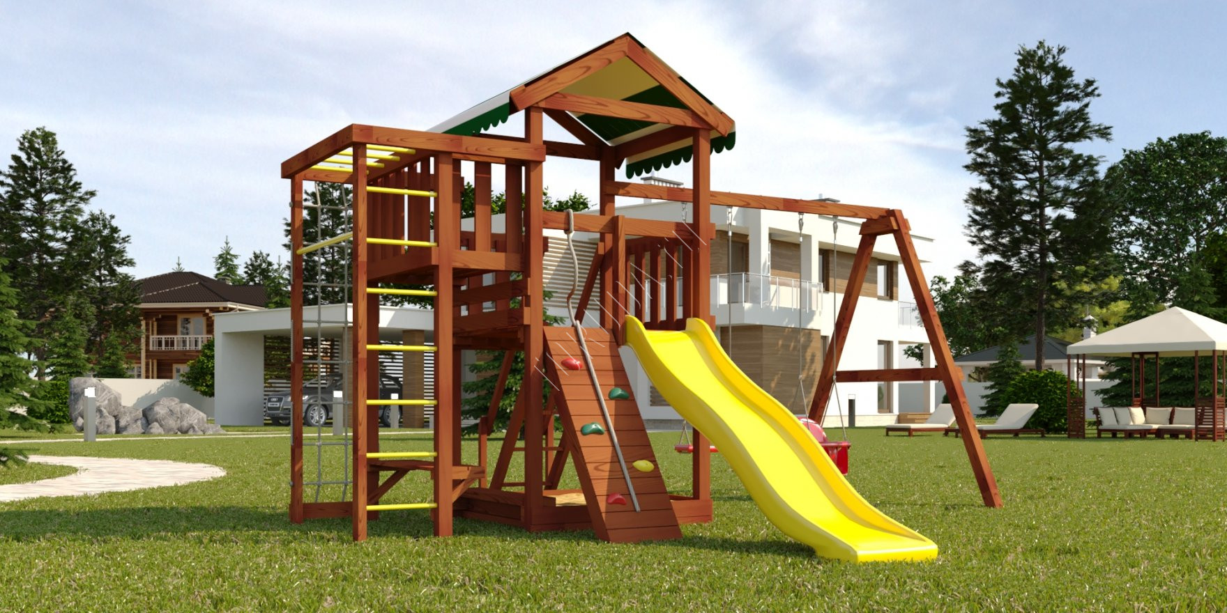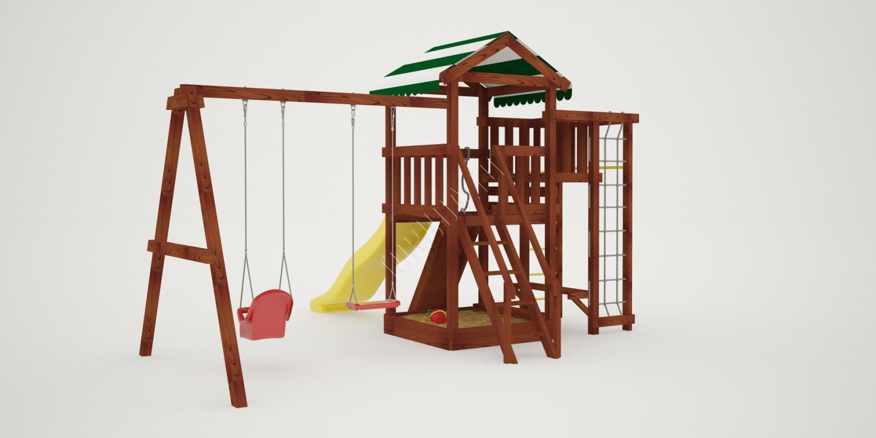 Конструкция сертифицирована и безопасна. Крепежи скрыты под хорошо закрепленными заглушками – поэтому даже малыши не поранятся. Каркас состоит из натуральных деталей – клееного бруса квадратного сечения со стороной 75 мм. Во избежание получения заноз и ссадин дерево отшлифовано, а края скруглены.
