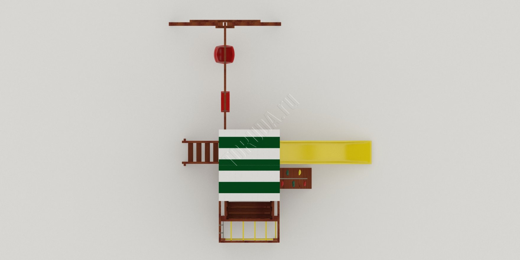 Игровая башня – центр спортивного строения с платформой на уровне 1200 мм от земли. Внизу расположилась песочница размером 1.29 м х 1.29 м и лавочка. В развитии силовых показателей помогут шведская стенка, сетка-лазалка, турник и рукоход.