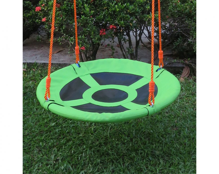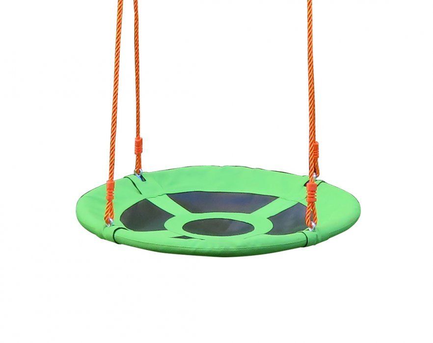 Комплекс включает в себя: веревочные качели, качели - гнездо и качели для малышей, и горку.