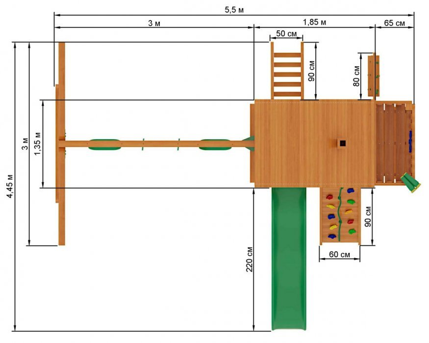 Конструкция городка прочна и надежна - в основе клееный брус сосны и массив лиственницы, дерево отшлифовано, покрыто лаком, соединения и болты скрыты, углы завальцованы. Изделие не боится дождя и снега, устойчиво к воздействию УФ, подойдет для установки на любой приусадебной территории, ровной, свободной от насаждений.