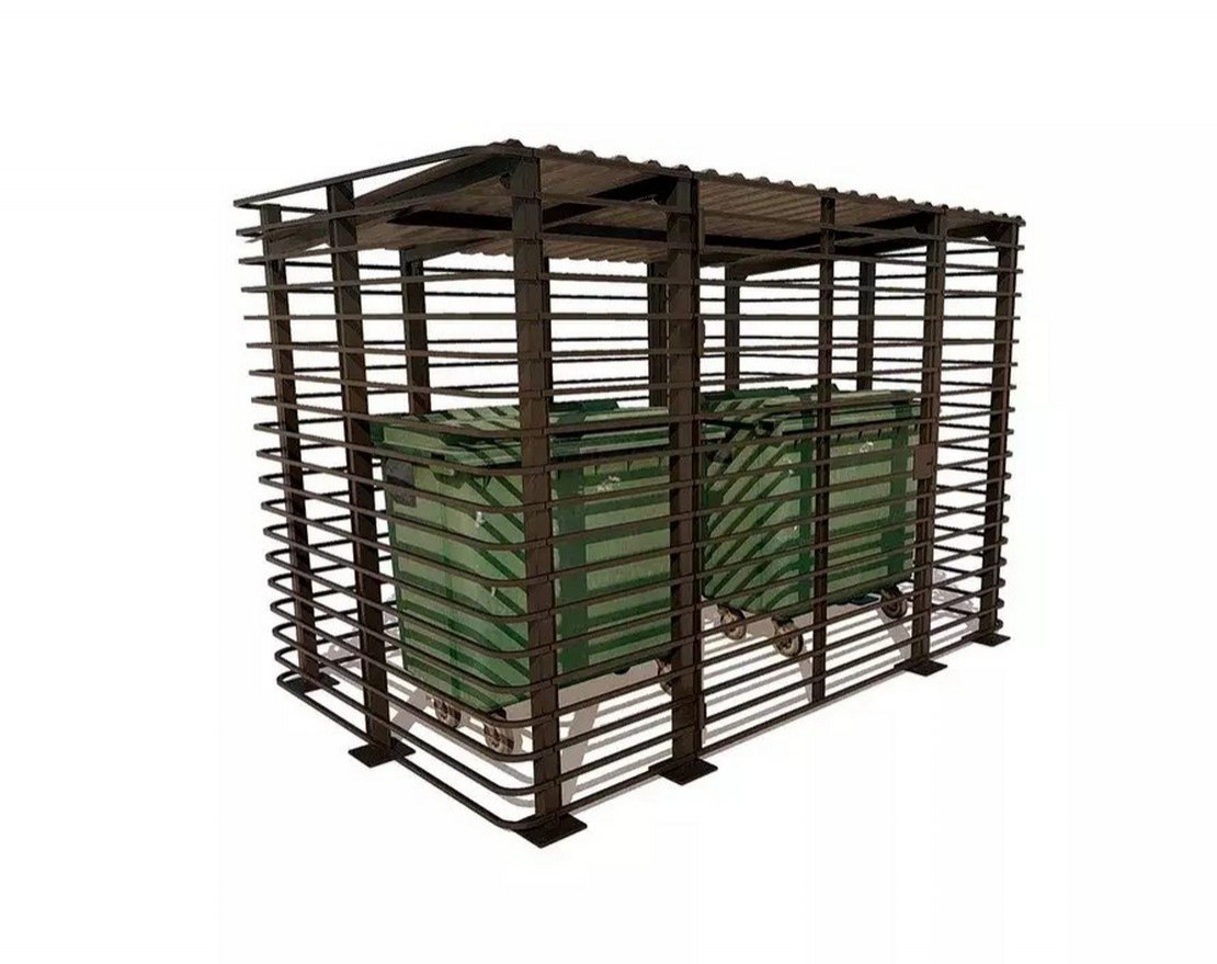 Контейнерные площадки изготовлены из профильного материала, не имеют сплошных стенок и оснащены калиткой с замком. Крыша выполнена из профильного листа, установлена под небольшим наклоном. Объект рассчитан на два стандартных мусорных бака. В конструкции имеются каркасные направляющие с установочными площадками в нижней части. За счет нескольких монтажных оснований объект размещается на неровной поверхности. Калитка с замком располагается по центру широкой части, ворота легко открываются и не касаются земли. Для облагораживания территории на небольшом участке советуем купить контейнерные площадки сквозной конструкции, которые не выглядят массивными.