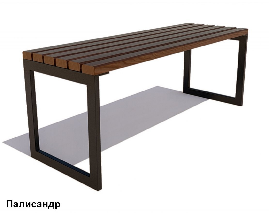 Минималистичная скамейка впишется в ландшафтный дизайн любого стиля. Высокопрочные деревянные брусья надёжно крепятся на стальном каркасе. Эти материалы полностью экологичны, прослужат несколько десятилетий. Отсутствие подлокотников и спинки даёт возможность свешивать ноги по всем сторонам лавочки. Тип крепления — анкерный.