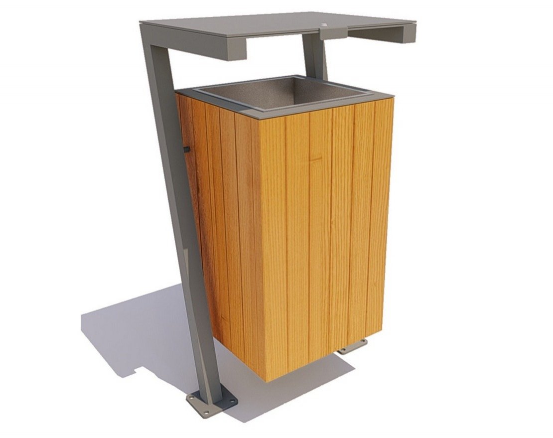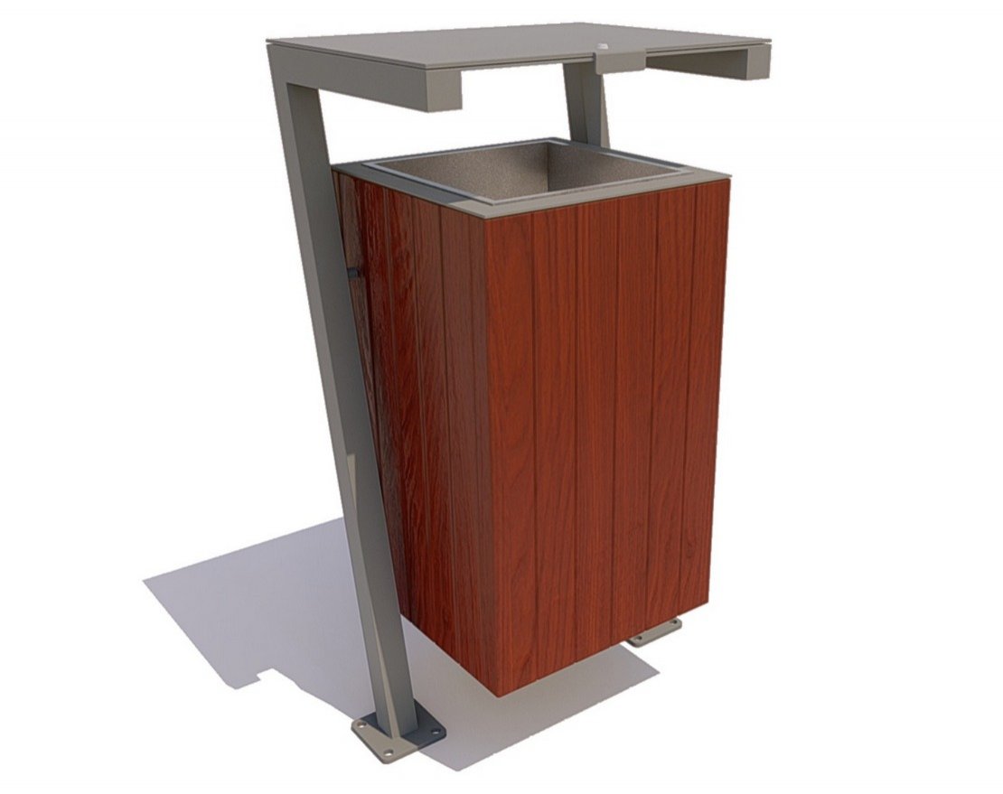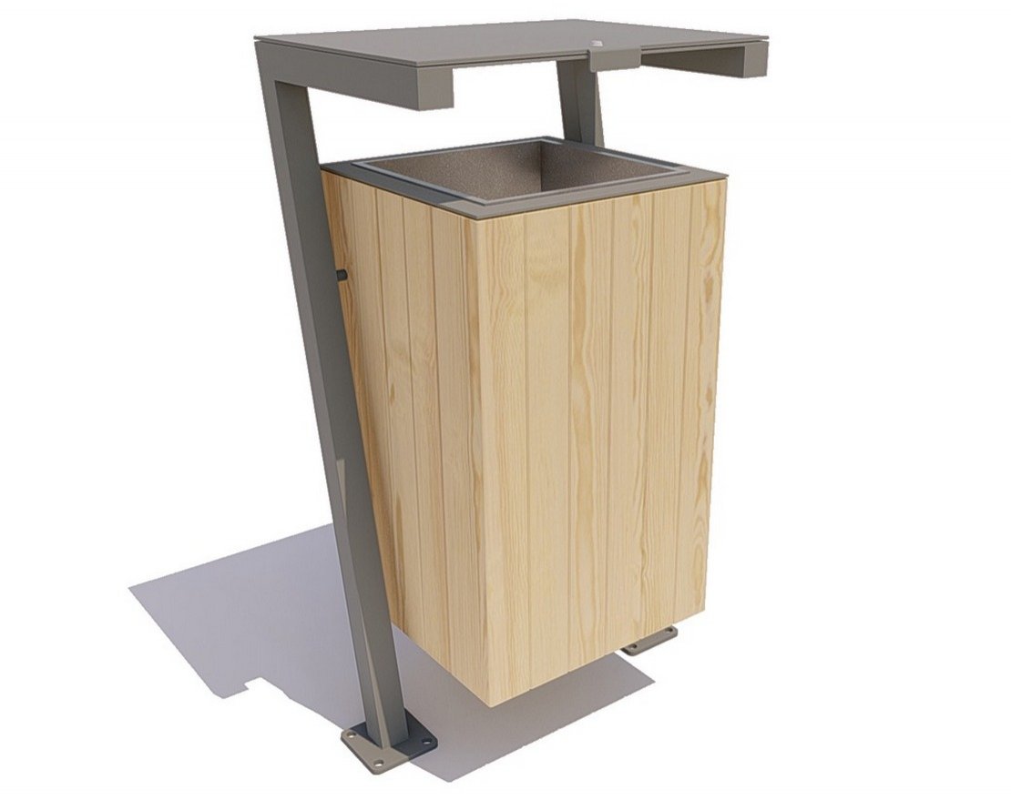 Уличная урна «Гамма» сделана из металла и обшита деревом. Эргономичная металлическая часть изделия произведена из стального профиля и листового металла (пепельница), загрунтованного и покрытого полимерной порошковой краской в цветах палитры RAL. Обшивка — лакированный брус, который одновременно смотрится стильно, неброско и в духе тренда на экологичность.