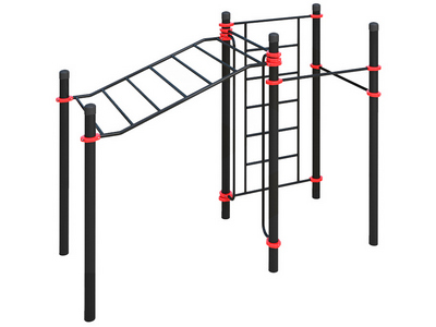 Комплекс состоит из шести опорных столбов высотой: 3 шт. - 2530 мм, 1 шт. - 2300 мм, 2 шт. - 2000 мм, трех перекладин для подтягиваний длиной 1200 мм, шведской стенки и рукохода в подъем. Элементы крепятся к опорным столбам при помощи хомутов. Высота фиксации перекладин для подтягиваний: 1 шт. - 2350 мм, 1 шт. - 2100 мм и 1 шт. - 1800 мм. Шведская стенка крепится на высоте 2450 мм. Состоит из перекладин, расстояние между которыми 373 мм. Высота шведской стенки - 2073 мм, ширина - 1200 мм. Рукоход в подъем крепится к опорным столбам на высоте: 1700 мм - в нижней части и 2166 мм - в верхней части, длина рукохода 1790 мм. Комплекс оснащен поручнями для инвалидов-колясочников.
