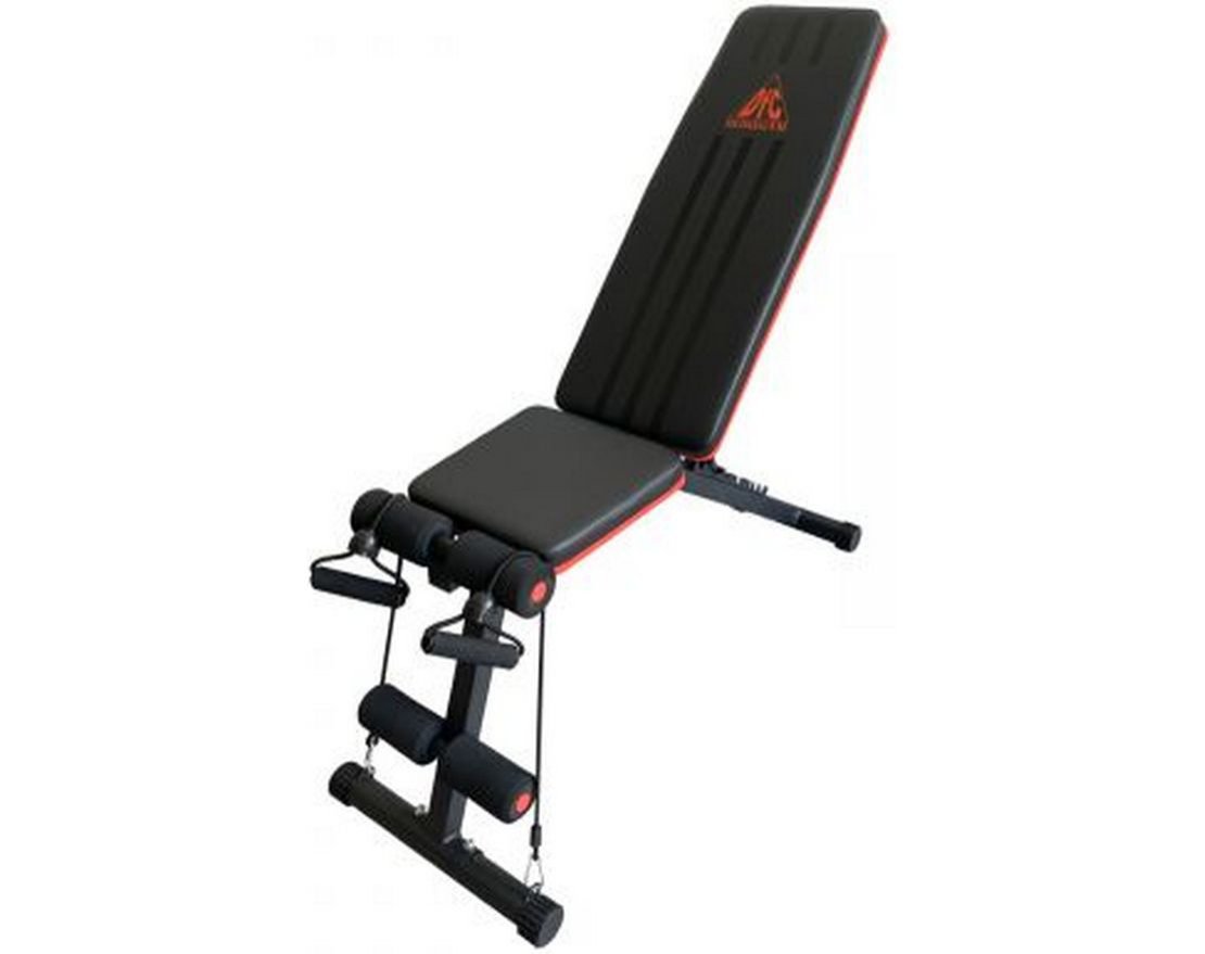 Универсальная скамья DCH310 предназначена для домашних тренировок на различные группы мышц: во время занятий можно использовать собственный вес и дополнительные отягощения, гантели. Имеет стильный дизайн: обивка и каркас чёрного цвета, с яркими красными декоративными элементами.